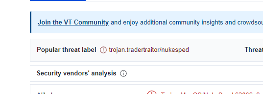 将压缩包放到 virustotal 分析,得到这个 C2 的家族 - trojan.tradertraitor/nukesped