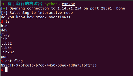 vuln函数通过gets()函数来接收用户的输入,由于gets不限制输入长度,所以存在明显栈溢出,通过覆盖返回地址,跳转到call_system去,压入参数'/bin/sh'的地址,让'/bin/sh'作为system函数的参数即可getshell