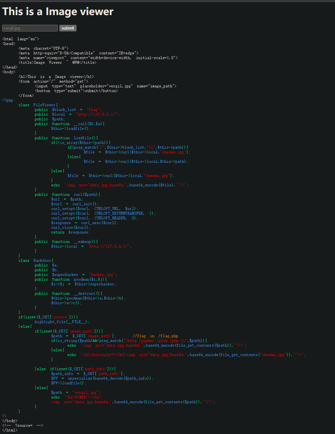 故构造如下POP链:FileViewer -> Backdoor::__destruct() -> FileViewer::__call() -> FileViewer::loadfile() -> FileViewer::curl()